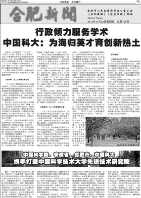 在合肥市委宣传部、外宣办的大力支持下,经新闻中心周密策划和采访,澳大利亚知名华文报纸《华夏周报》11月29日以整版报道的方式对我校进行重点宣传,报道主题是“中国科大:为海归英才育创新热土”。