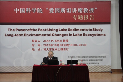 10月30日晚上,Smol教授在我校东区水上报告厅向全校师生做了题为The power of the past: using lake sediments to study long-term environmental changes in lake ecosystems的学术报告。报告以全球变化与生态环境演变为主题,总结了近几十年来湖泊生态环境变化的研究进展,讨论了湖泊酸化、富营养化和污染传递的环境问题。他还介绍了古湖沼学中已广泛用于气候变暖效应的研究,如北极浅湖数据显示持续千年的水体近来已干涸,这些研究将区分气候变暖和其他环境压力的作用并揭示湖泊系统是如何响应环境变化的。地球和空间科学学院执行院长陈晓非教授主持了报告会。