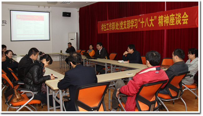 11月12日上午,学生工作部(处)党支部召开全体党员大会,就中国共产党第十八次全国代表大会报告精神的学习贯彻进行交流座谈。座谈会由学生工作部(处)党支部书记、学生工作部(处)长董雨主持。