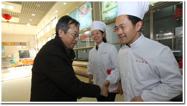 1月30日中午,学生工作部(处)、研究生院和饮食服务集团在东区学生餐厅联合举办除夕餐会,给寒假不回家的同学送上了新年的祝福。校党委副书记鹿明,副校长张淑林、周先意,校长助理尹登泽,有关部门负责人,院系学生工作负责人和班主任老师,以及寒假留校学生约200人参加了餐会。餐会由学生工作部(处)长董雨主持。