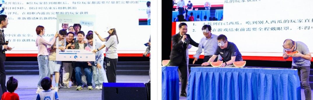 晚会还穿插了互动环节,“挤相框拍照”和“蒙眼吃西瓜”游戏中,系党总支书记和同学们一同参与、同场竞技,共同体验这充满趣味的挑战,将现场气氛推向高潮。
