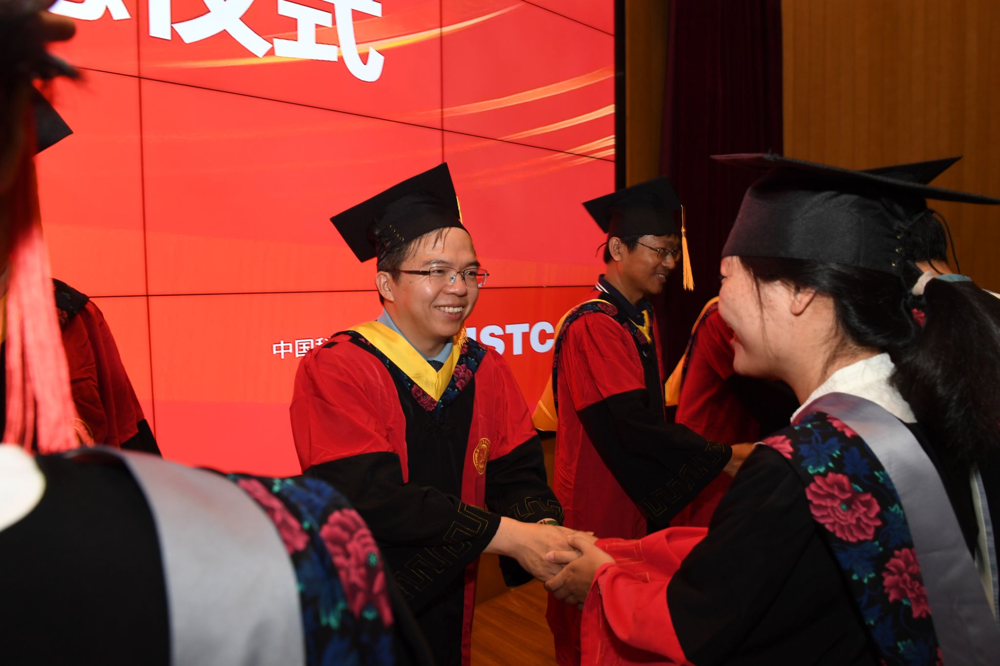 在庄严的乐曲声中, 毕业生们身着学位服有序地走上主席台, 导师代表们为他们扶正流苏并留下了珍贵合影。
