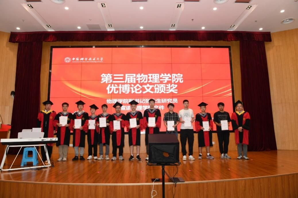 物理学院党委副书记张永生研究员宣读了2024年度物理学院优秀博士论文获得者名单,并向他们表示祝贺,邓宇皓等12位同学的博士学位论文获得该殊荣,陈宇翱、周正威为获奖同学颁发了物理学院优秀博士学位论文证书。