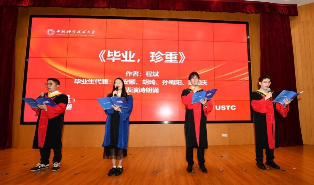 毕业生代表胡琦、孙蜀阳、赵柯庆、周安顺朗诵了《毕业,珍重》,抑扬顿挫的音韵深深激起了毕业生们的共鸣,时光匆匆,那些奋斗的岁月仿佛还在眼前,诗歌既表达出同学们对母校的不舍,对同门的祝福,也展现了对未来的期许,“少年不惧岁月长,彼方尚有荣光在”。