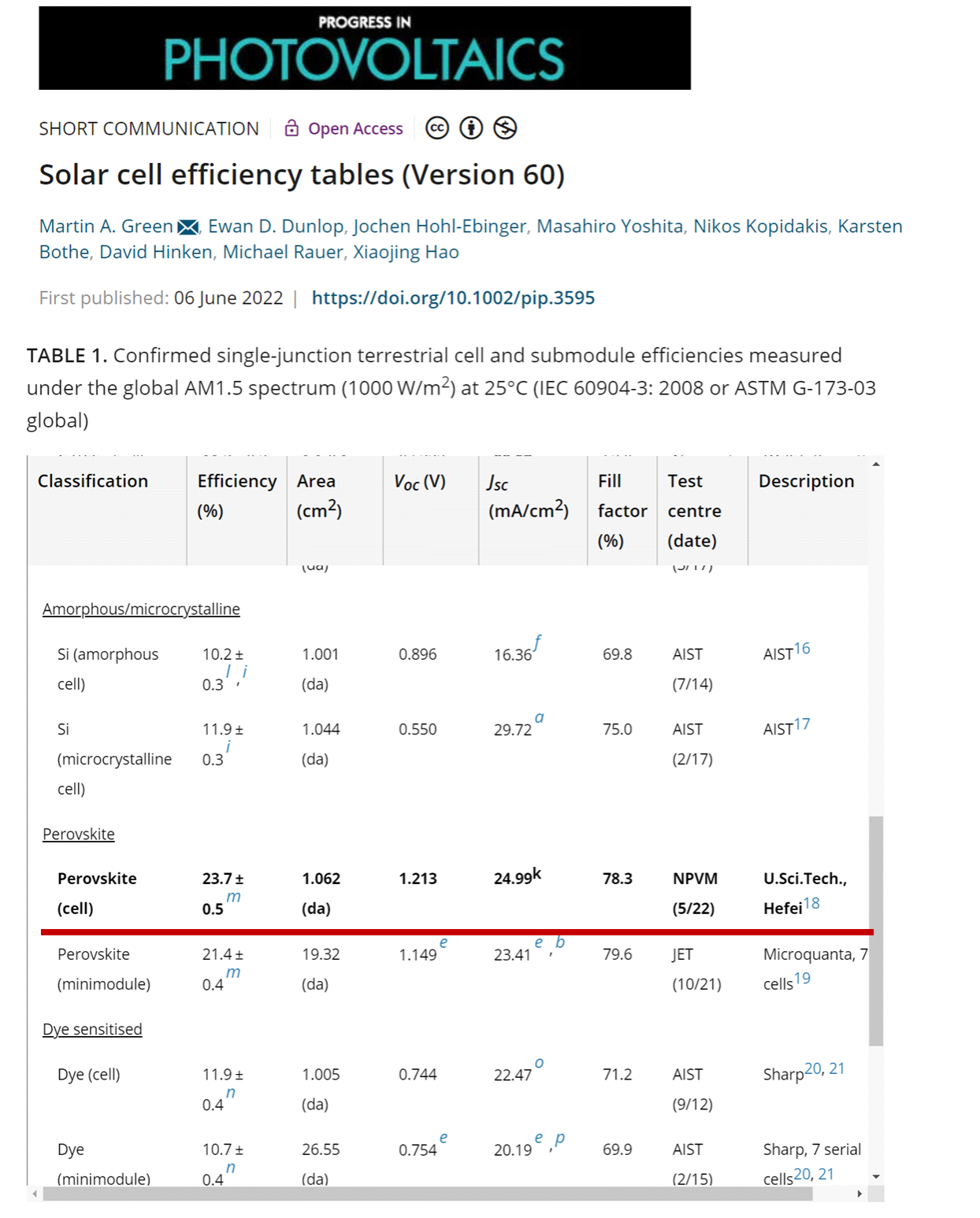 《Solar cell efficiency tables》效率表由澳大利亚先进光伏中心联合美、日、意、澳等多国科学家统一审核和发布,具有近30年历史,其客观性和荣誉为国际光伏学术界和工业领域所公认,代表了光伏各细分领域的最前沿技术动态,具有重要指导意义。本次收录代表着中科大在光伏前沿研发的突破和引领能力。