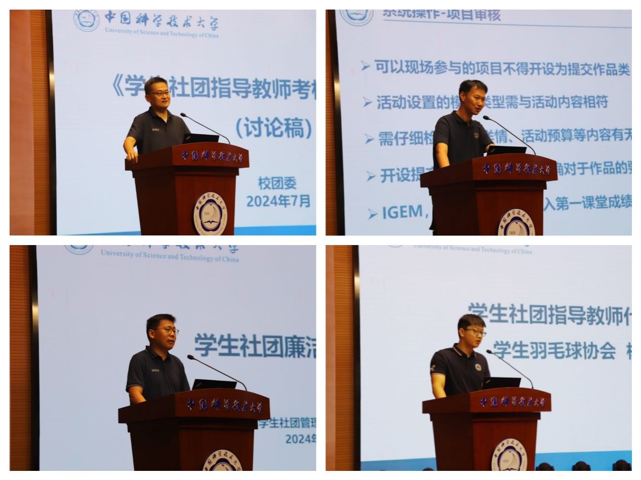 千坤从我校学生社团指导教师概况、调研我校学生社团指导教师与学生社团负责人情况切入,介绍了我校拟试行学生社团指导教师考核办法。谢羿从制度体系、系统操作、沟通渠道三个方面做“第二课堂”系统使用培训。李海欧结合学生社团实际情况,向指导教师做学生社团宣传思想文化培训与廉洁教育培训。学生羽毛球协会指导教师、本科生院体育教学中心杨旭东老师作为指导教师代表介绍了自己指导社团的经验和心得体会。