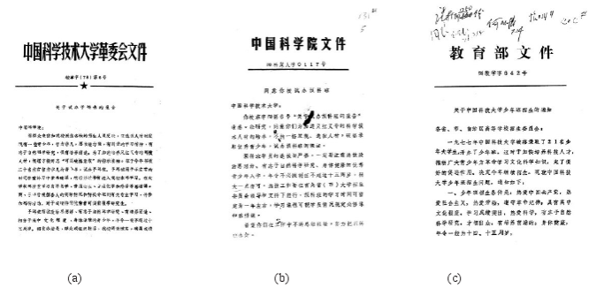 图1 中国科大关于试办预科班的报告(a)、中科院关于同意试办预科班的批文(首页,(b))和教育部关于少年班招生的通知(首页,(c))。