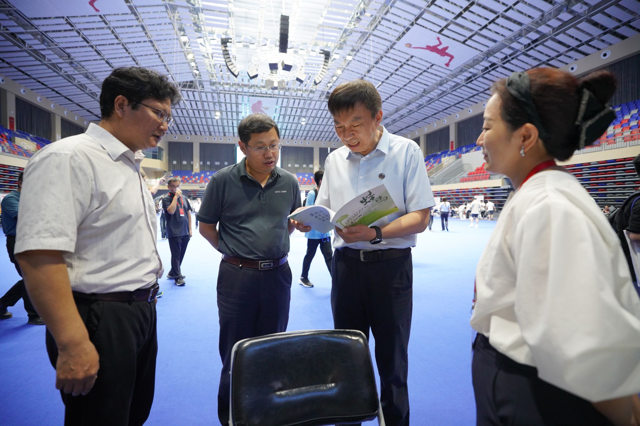 在迎新工作开展地点,校领导与报到的新生,以及参加迎新的工作人员、志愿者交流,仔细询问新生报到等情况,在院系迎新点翻阅迎新礼包,了解各院系迎新安排,并慰问参加迎新的工作人员和志愿者。
