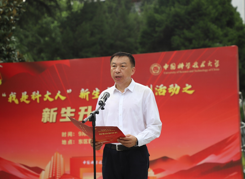 舒歌群在讲话中指出,今年是新中国成立75周年和我国第一颗原子弹爆炸成功60周年,9月20日,我们也将迎来中国科大66岁生日。他希望同学们传承热爱祖国、无私奉献的两弹一星精神,做科教报国的科大人,将爱国主义情怀融入个人的理想和追求之中;传承自力更生、艰苦奋斗的两弹一星精神,做追求卓越的科大人,在探索世界科技前沿中找准时代定位,在解决国家战略难题中实现自立自强;传承大力协同、勇于登攀的两弹一星精神,做全面发展的科大人,肩负时代责任,高扬理想风帆,做德智体美劳全面发展的“六有”大学生。他鼓励同学们牢记习近平总书记嘱托,在青春赛道上以理想者、担当者、吃苦者、奋斗者的姿态,凝心聚力、开拓创新,在新时代新征程中谱写科大人的新辉煌。