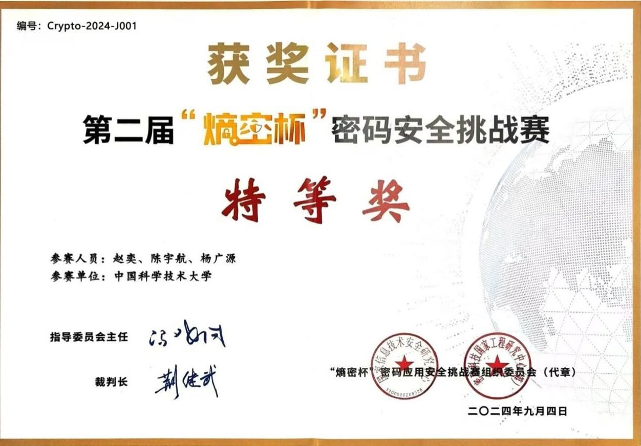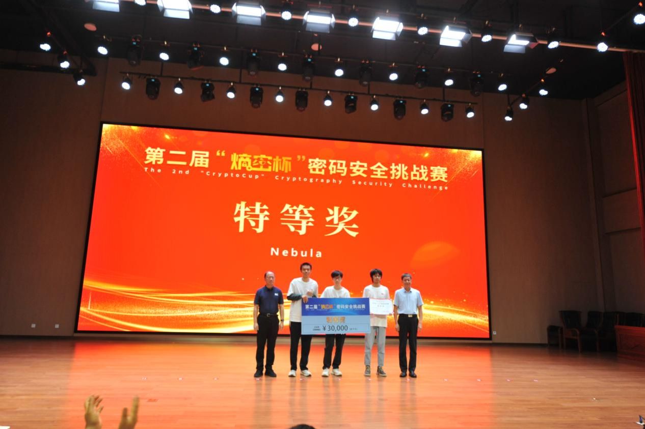 9月4日,中国科学技术大学星云(Nebula)战队在我校网络空间安全学院的组织下赴宁夏征战第二届“熵密杯”密码安全挑战赛,由赵奕、陈宇航、杨广源等三位学生组成的Nebula战队奋勇争先,与众多强队一同角逐,取得了决赛特等奖(冠军)。