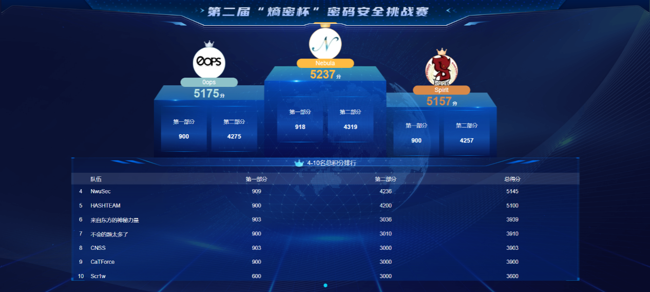 第二届“熵密杯”由国家信息技术安全研究中心、密码科技国家工程研究中心主办,并由中国科学院院士冯登国教授担任赛事指导委员会主任。本届赛事召集了来自全国29个省区市的50家知名高校、91家测评机构、8家安全企业以及1名个人,总计448名密码专业技术人才参赛。大赛采用线下竞赛的形式,全面考察参赛团队在密码应用安全缺陷识别、密码算法功能编程调用、网络协议数据解析、系统配置核查以及源代码审计等方面的实战能力。最终,中国科学技术大学参赛战队“Nebula”获得特等奖,上海交通大学、吉林大学、西北大学、山东大学参赛战队分获一等奖。