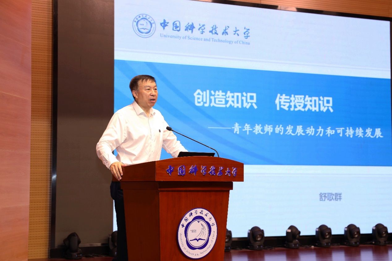 舒歌群以《创造知识 传授知识——青年教师的发展动力和可持续发展》为题,为新进教师讲授“入职第一课”。舒歌群首先领学了2024年9月9-10日习近平总书记在全国教育大会上的重要讲话精神,之后他从大学的产生和发展、文化的传承与创新、教学和科研的关系讲起,回顾了66年来中国科大建校的初心使命和办学的宝贵经验。舒歌群对新进教师成长提出四点建议:一是坚持教育者先受教育,以德立身、敬业立学、勇担使命;二是要践行教育家精神,遵守教师职业道德,坚守底线;三是青年教师要去功利化,更加从容自信地规划职业发展生涯;四是树立“教学学术”观念,不断更新教学内容、改进教学方法、提升教学质量。