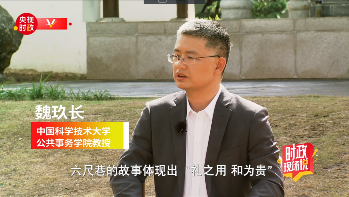 10月17日,习近平总书记来到安徽桐城市六尺巷考察,提出六尺巷承载着中国古人的历史智慧,要弘扬好中华民族传统美德,相互礼让、以和为贵,解决好民生问题,化解好社会矛盾,使我们的社会更加和谐。10月18日上午,中央广播电视总台“时政现场说”节目跟随习近平总书记的脚步走进了安徽桐城市六尺巷,我校公共事务学院魏玖长教授应邀参加此次节目,共话源远流长、历久弥新的六尺巷文化,并就六尺巷典故与“新时代六尺巷工作法”在基层社会治理中的作用进行了解读。