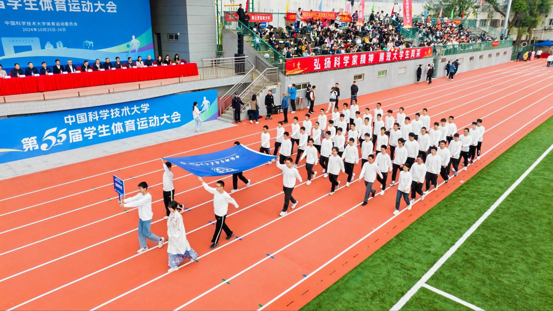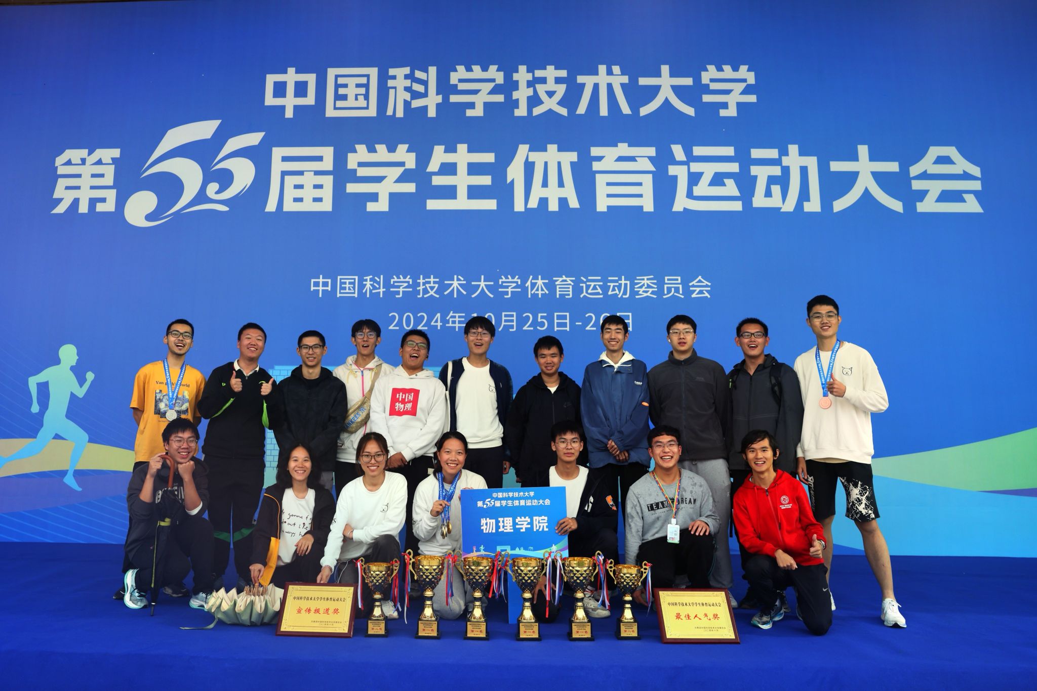 在为期两天的激烈角逐与精彩纷呈的竞技盛宴后,校第55届学生体育运动大会于10月26日下午圆满落幕。物理学院派出了由本科生及研究生组成的125名运动员阵容,他们彼此扶持、奋勇争先,以卓越的表现征服了赛场,一举夺得本科生与研究生男女团体总分双料冠军的辉煌成绩。此外,学院凭借整齐划一的方阵队列与高涨的观众热情,荣获2024年体育运动会“最佳人气奖”及“宣传报道奖”的殊荣。