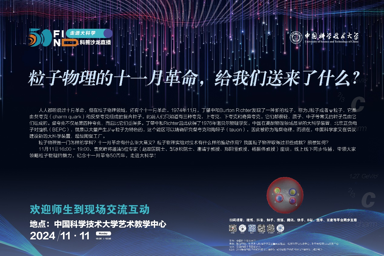 11月11日,为纪念“十一月革命”50周年,中国科学技术大学科学传播研究与发展中心联合物理学院、核探测与核电子学国家重点实验室以及粒子科学与技术中心等单位联合举办了主题为《走进大科学:粒子物理的十一月革命,给我们送来了什么?》的FIND论坛·科普沙龙直播活动。