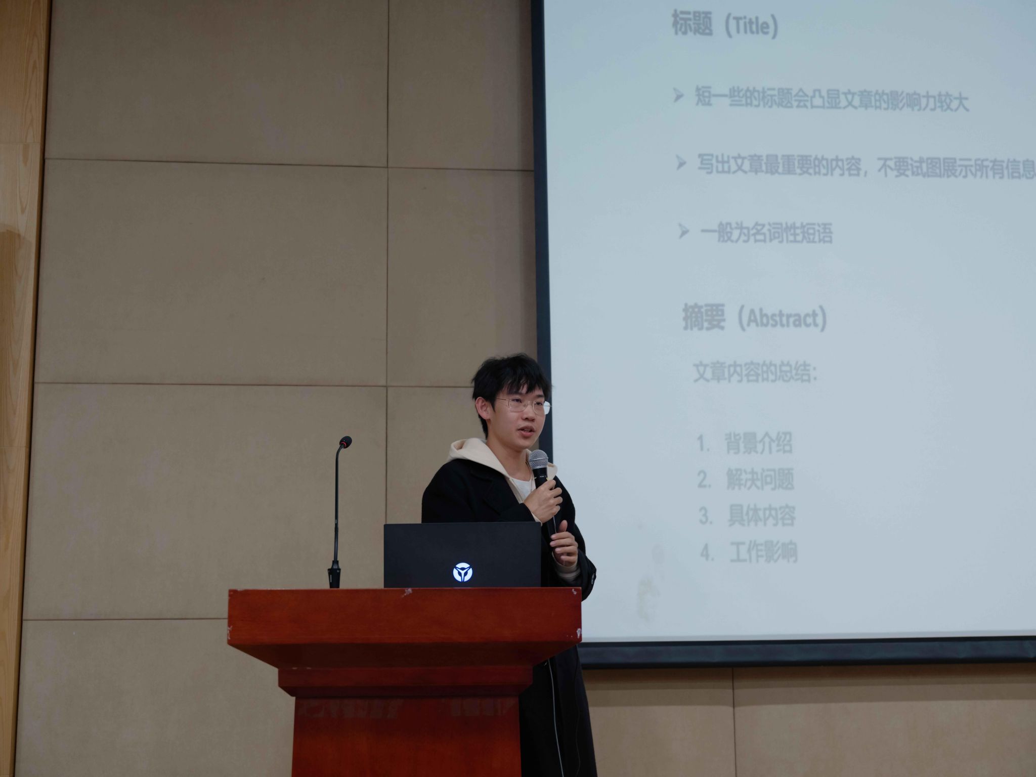 在朋辈分享环节,物理学院谢可为讲述了论文核心思路和图表的重要性,并展示了如何在论文各部分清晰表达出研究思路和结果的结构化方法;物理学院张劢分享了论文的结构要点、写作技巧,建议同学们主动与导师加强沟通交流来提升科研和论文质量;合肥微尺度物质科学国家研究中心程奥远介绍了他总结的科研模式,分享了面对问题时激发科研动力的经验和梳理实验逻辑的方法,并鼓励同学们珍惜时光,早日实现自己的科研梦想。