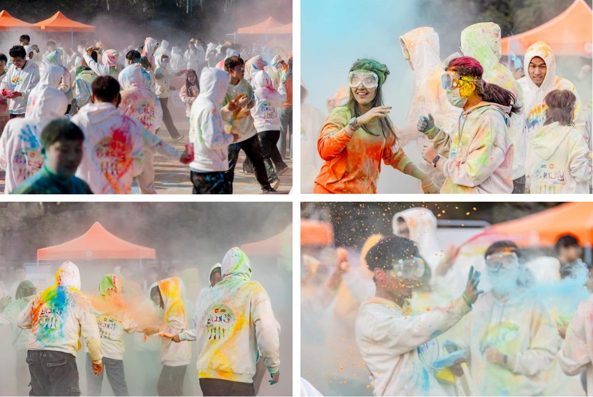 与此同时,最受期待的“彩虹狂欢”也在操场正中央分批进行,现场师生手持彩粉袋,纷纷进入“狂欢区”场地,场地上充满着欢笑声、呐喊声,大家用彩粉释放压力,互相泼洒、涂抹,整个操场瞬间变成了一个五彩斑斓的欢乐海洋,周围的空气中弥漫着彩粉,就像是被带入了一个色彩的世界,五彩的粉末在空中飘扬,形成一道道美丽的彩虹。