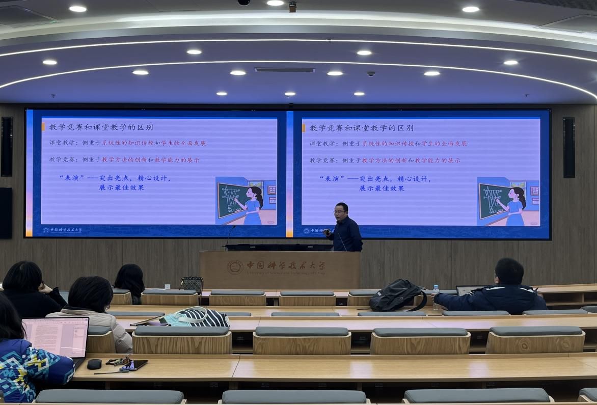 本次培训由数学科学学院党委书记、副院长左达峰教授主讲。他从课堂教学、青教赛规则、评委视角引入,分享了个人作为青年教师教学与参赛、教务管理与教学竞赛组织的经历与思考,并分析了作为第七届全国高校青年教师教学竞赛决赛专家评委的评审经验,深入细致地对教学设计、教学过程、目标成效、教学反思等方面进行了解读。他提醒参赛教师们务必仔细研读竞赛规则,做好充分的赛前准备工作,并期待每位教师能够展现教学风采,全力以赴提升教学技能。