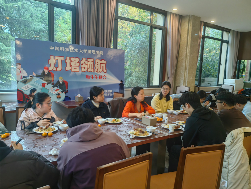 12月4日,管理学院秋季学期第二期“灯塔领航——师生午餐会”在东区专家楼成功举办。本次活动聚焦金融主题,邀请了中国科大管理学院教授、国际金融研究院院长助理、教授王潇作为主讲人,与大一新生及本科其他年级学生代表共进午餐,针对统计与金融领域前沿研究和就业前景进行了深入的交流,为同学们答疑解惑。