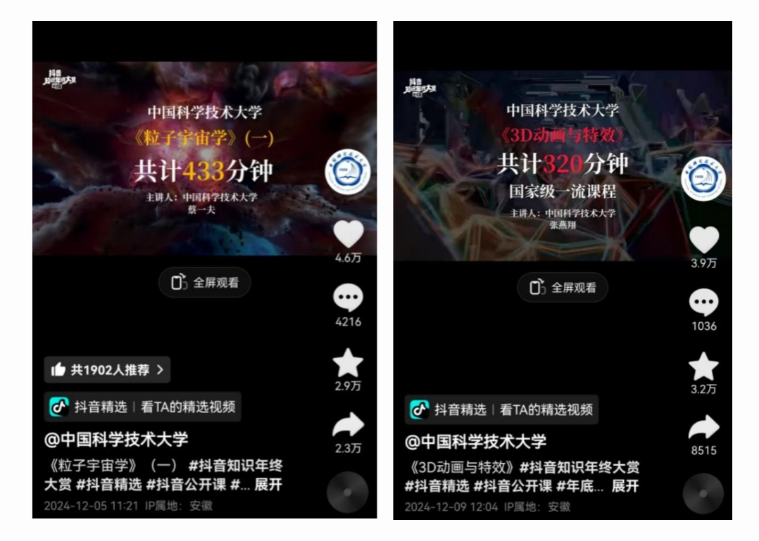 近日,学校将12门精心策划制作的优质课程,以超长公开课的形式发布在抖音平台,累计观看量超过461万次,点赞数持续攀升。热门课程《粒子宇宙学》观看量超过百万次;《天文学导论》《电磁学》《3D动画与特效》等课程参与的热点进入抖音总榜TOP10,成为抖音平台教育领域的热门话题。