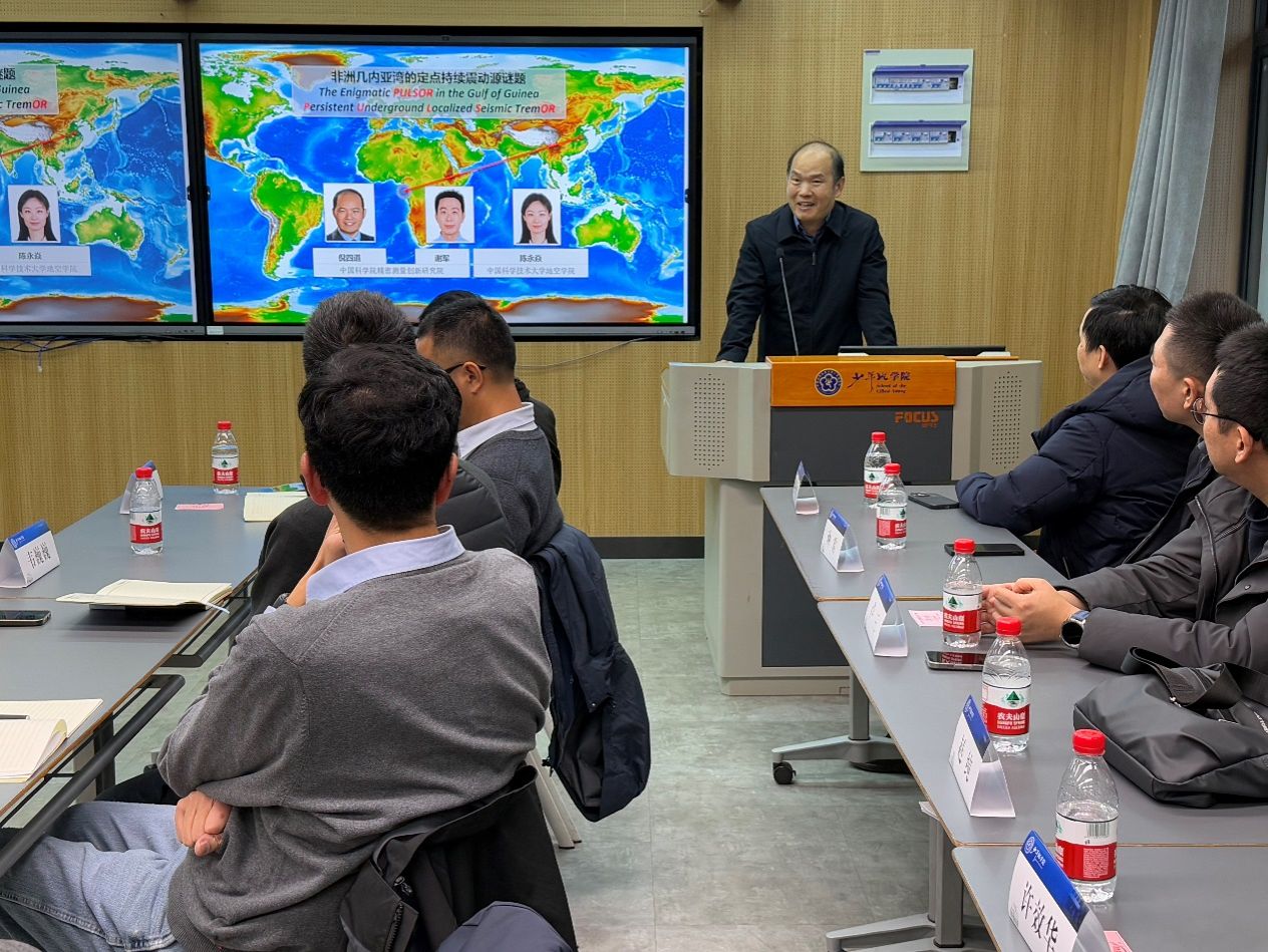 随后,少年班学院杰出校友倪四道院士为师生们带来了一场精彩的报告,深入浅出地介绍了团队在非洲几内亚湾的定点持续震动源谜题方面的杰出工作,用具体的实例展现了学科交叉研究的重要性。报告内容丰富,引人入胜,不仅拓宽了同学们的学术视野,也激发了他们对行星科学研究的浓厚兴趣和热情。