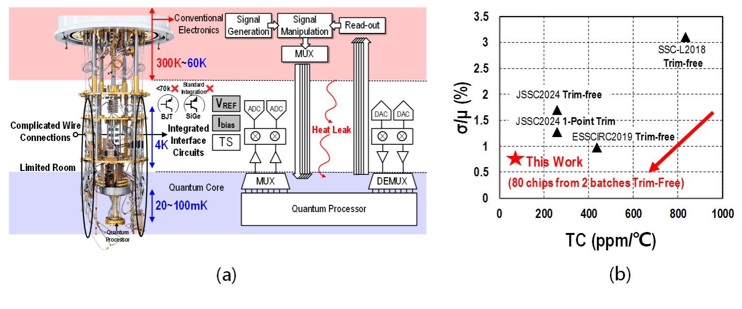 图(a) 量子接口芯片的工作环境;图(b)温度与工艺精度相较于前沿研究展现出显著优势。