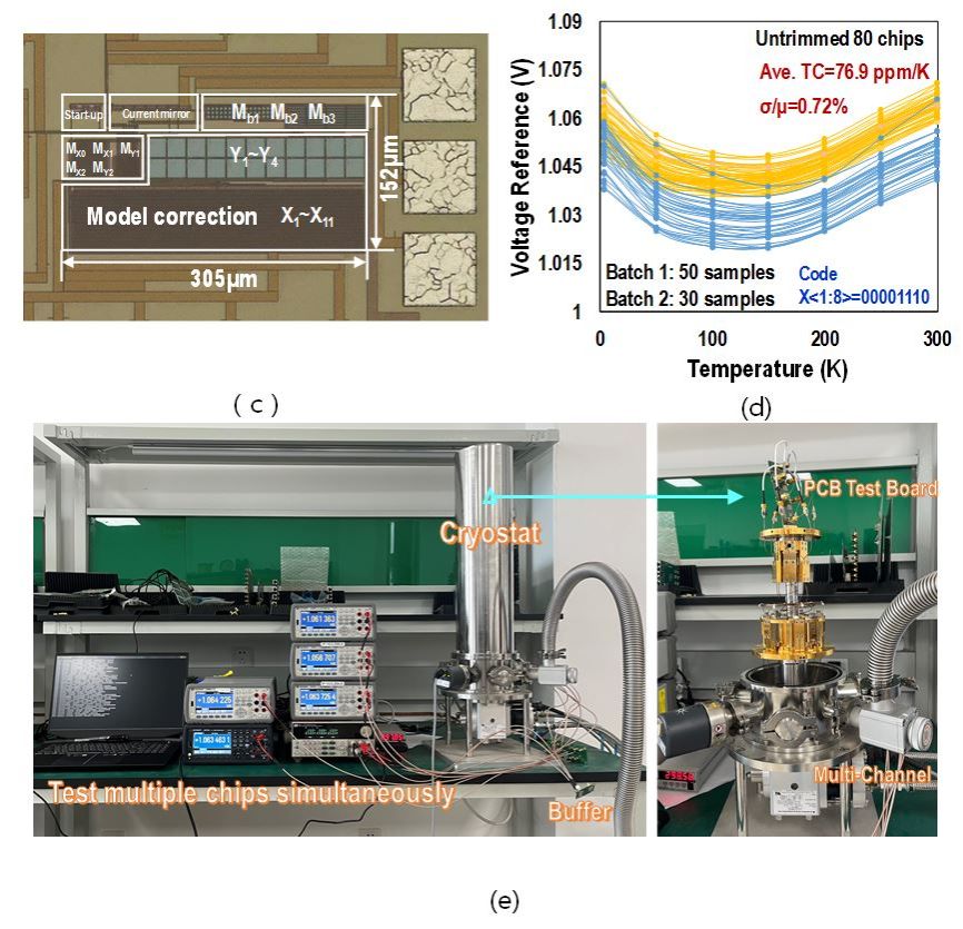 图(c)芯片显微镜照片;图(d)测试的两批次共80颗未修调芯片的温度曲线;图(e)稀释制冷机和自动计数系统的测量环境。