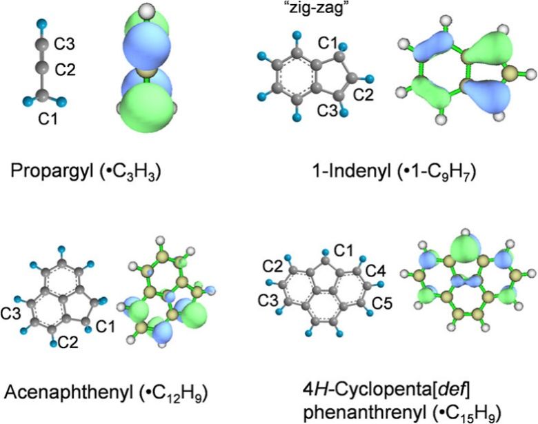 图1.炔丙基(?C3H3)、茚基(?1-C9H7)、苊基(?C12H9)、环戊并菲基(?C15H9)的分子结构和单占据分子轨道