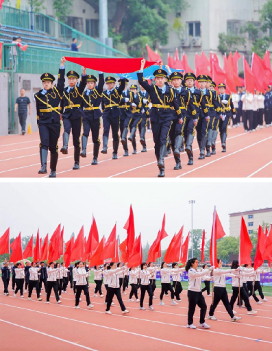 伴随着激昂的运动员进行曲,国旗护卫队擎着国旗、校旗,基础教育集团附属中学组成的红旗队率先入场。他们目光坚毅、步伐有力、气势如虹,为运动员入场式拉开了序幕。