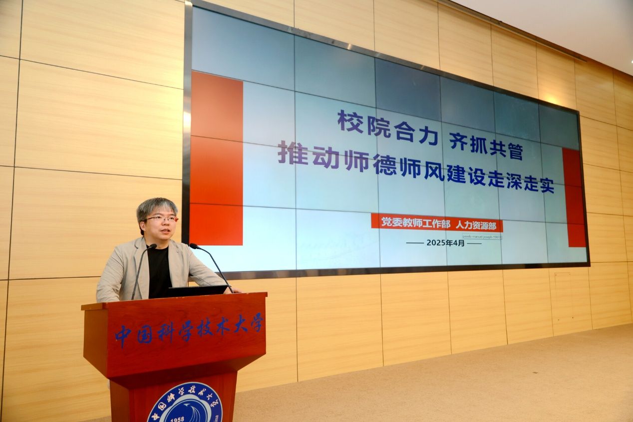 陈宇翱作《推动师德师风建设走深走实》专题报告。他表示,学院一直对师德师风建设工作高度重视,并将党的领导贯穿教学队伍建设的全过程。他希望全体教职工能够始终秉持求实创新的公正态度,胸怀至诚报国的理想信念,涵养启智润心、因材施教的育人智慧,共同将物理学院教师队伍打造成新时代、高水平的师资力量。