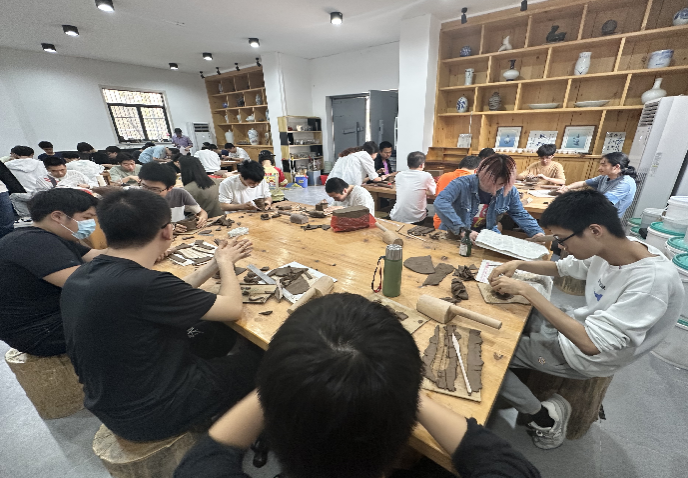 “切泥、揉泥、拍打、上片……”跟随着导师的讲解,同学们纷纷挽起袖口,手持木搭子在工作台前跃跃欲试。特聘导师周先稠教授轻托学生手腕,一边示范一边指导:“科研追求效率,但手艺讲究‘慢工出细活’!”同学们全神贯注地投入创作,一捏一揉间,那些酝酿多时的创意,正通过指尖的温度缓缓具象,映照着传统匠艺与年轻思维的对话。