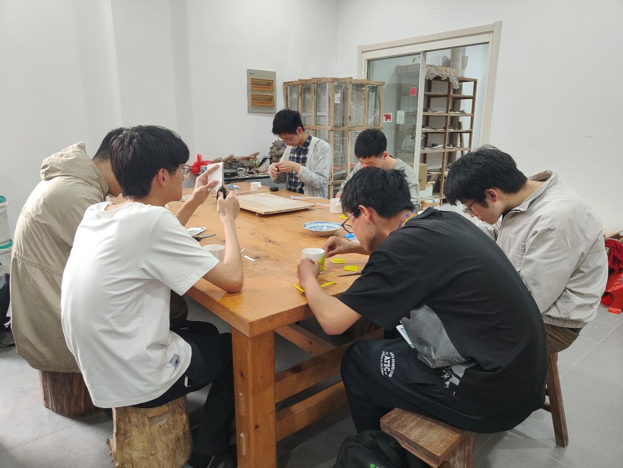 在手绘实践环节,导师团队将素坯与毛笔依次排开,边示范边讲解分水、填色等技法,鼓励同学们挥洒创意。同学们执笔点染,以青花钴料为墨,用毛笔在泥坯上绘制图案,有的以喜爱的动画形象为蓝本,用墨色釉料泼洒出梦幻宇宙;有的以瘦金体题写诗词警句,方寸之间尽显天地气象;更有同学将数学符号、电路板纹路融入图案,尽显科技人文交融之美。