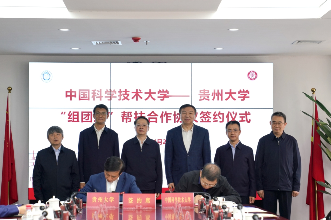 28日上午,《中国科学技术大学 贵州大学“组团式”帮扶合作协议》签约仪式在贵州大学举行。校党委常委、副校长邓建松,贵州大学党委常委、副校长张大林代表双方签署协议。贵州省委常委、省委统战部部长郭强,校党委书记舒歌群,贵州省科技厅党组书记项长权,贵州省委教育工委副书记宋广强,中国工程院院士、贵州大学校长宋宝安,校党委常委、宣传部部长王伟出席见证。根据协议,双方将紧紧围绕“双一流”建设目标开展交流合作,支持贵州大学提升人才培养、科技创新和社会服务能力,共同推动“组团式”帮扶合作工作迈上新台阶。