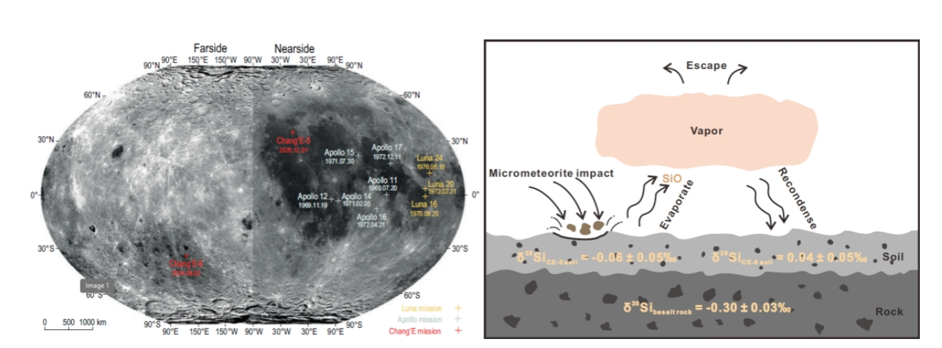 太空风化是月球表面物质长期在宇宙射线、太阳风、微陨石撞击等因素作用下发生的一系列物理、化学变化过程,对月球表面物质的成分和结构具有显著影响(图1)。为深入评估月球正反面的太空风化的效应,研究团队利用中科大金属稳定同位素实验室先进的同位素分析技术,对嫦娥五号和六号返回的月壤样品进行高精度硅同位素分析,测定了来自月球正面和背面样本的硅同位素组成。这一研究为理解月球正反面太空风化过程的差异提供了新的非传统稳定同位素证据,有助于完善月球表面物质演化模型。