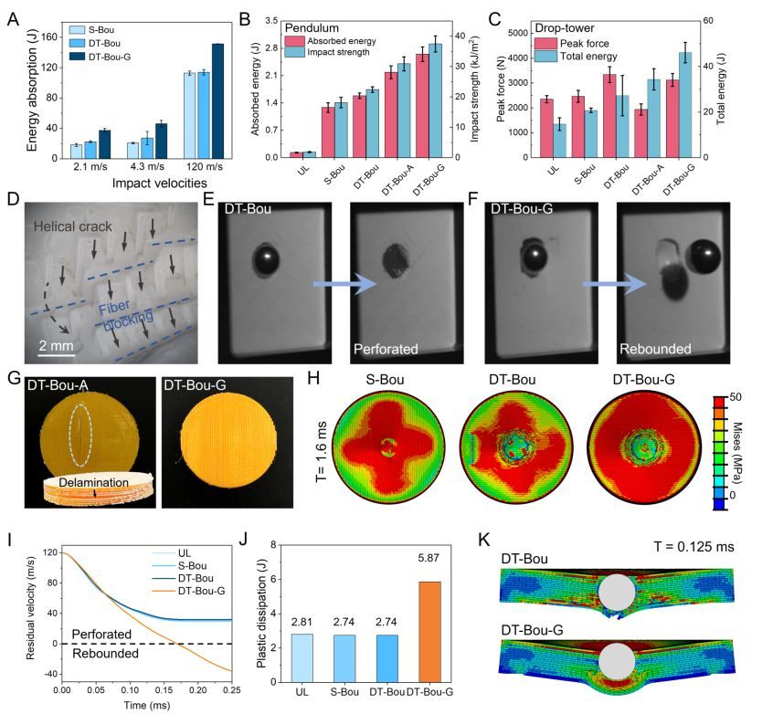 图2.仿生DT-Bou-G结构材料的力学性能及强韧化机理。(A)DT-Bou-G结构材料在全速度下均具有更优的抗冲击性能;(B-C)在摆锤(B)和落锤(C)冲击测试中,DT-Bou-G表现出更高的吸收能量;(D)双重布利冈结构通过横向纤维阻拦实现增韧;(E-F)在子弹冲击测试中,DT-Bou-G表现出更好的防护性能;(G)在落锤冲击测试中,梯度组分变化有效避免了开层;(H)有限元模拟显示DT-Bou-G在面对落锤冲击时实现更广泛的应力分布。(I-K)在高速子弹冲击时,DT-Bou-G可以弹回子弹(I),这是由于其具有更大的塑形耗散(J)和更广泛的应力分布(K)。