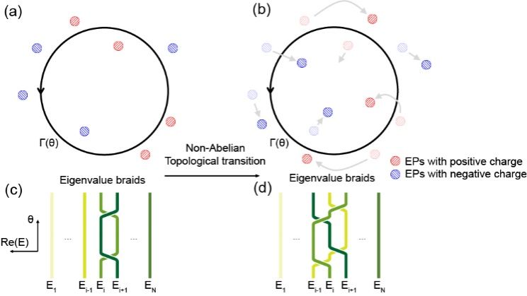 图1 非厄米非阿贝尔拓扑跃迁。(a)和(b)展示了由于不同类型奇异点之间的相互作用导致的非阿贝尔转变。(c)和(d)展示了能谱编织作为拓扑不变量对非阿贝尔转变的刻画。
