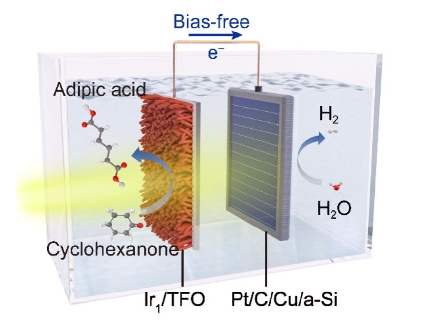 具体来说,研究人员们开发了一种单原子Ir修饰的Ti掺杂Fe2O3光阳极材料,在光-电协同作用下,以水为氧源,实现了己二酸的高效、高选择性生产。机理研究揭示了一种在原子水平上由光生空穴驱动的吸附*OH转移的非自由基反应机制。此外,将该光阳极和单片式非晶硅基光阴极集成,可实现具有长期稳定性的无偏压驱动光电催化己二酸合成。