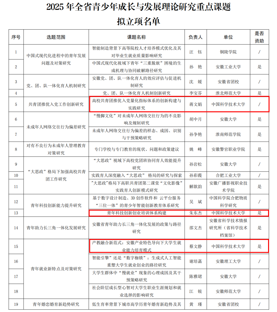 入选课题包括:蒋文娟《高校共青团推优入党量化指标体系的创新构建与实践研究》、朱东杰《青年科技创新创业培训体系构建》、蔡文静《产教融合新范式:安徽产业特色导向下大学生就业能力培育模式》、姬翔《为家乡企业插上梦幻黄山之翼——小镇青年博士的乡村振兴经验探究》。