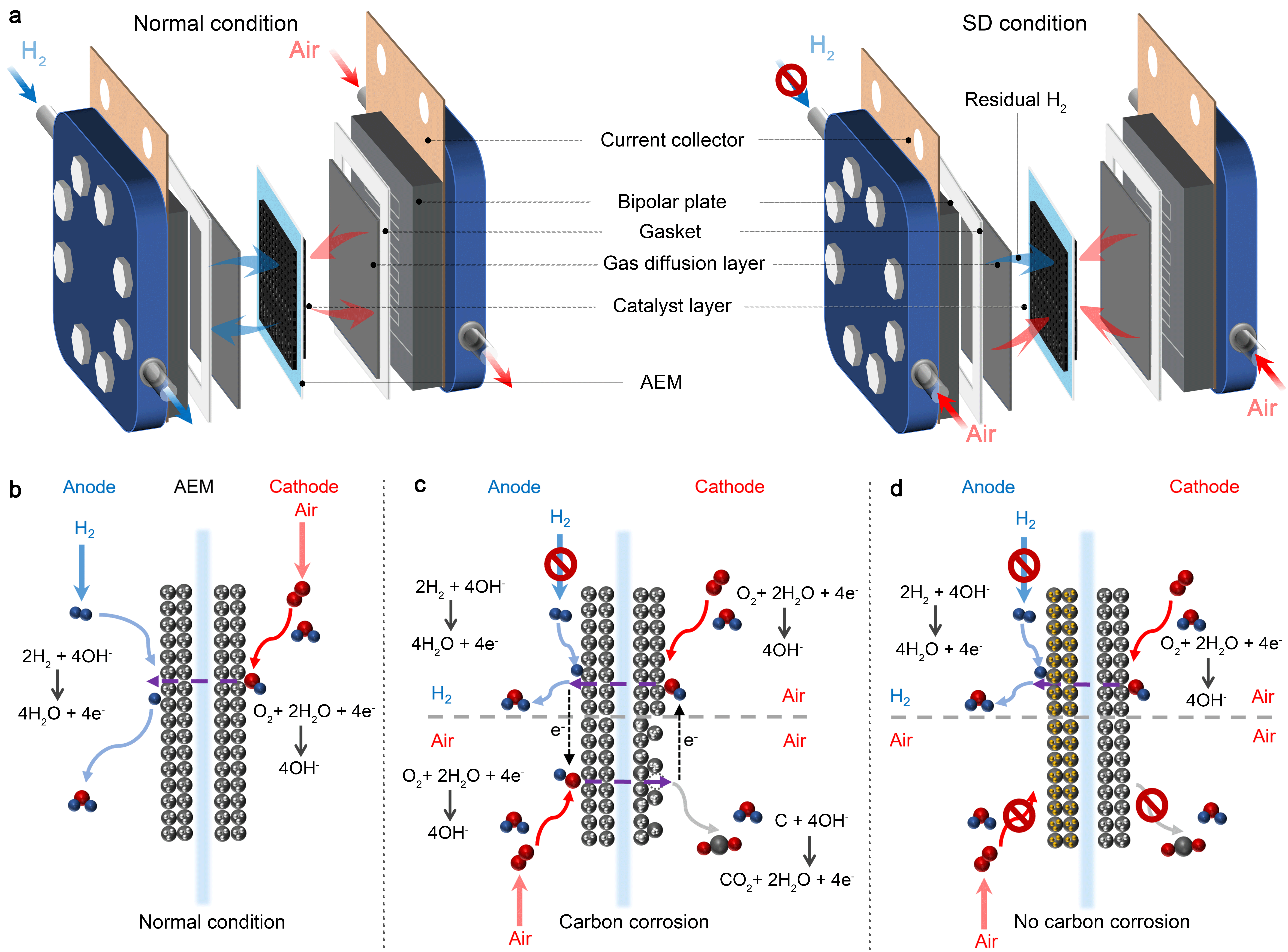 氢气燃料电池作为一种清洁高效的能源转换技术,其耐久性和成本是规模化应用的主要瓶颈。其中,启停(SU/SD)过程中的反向电流衰减(RCD)现象导致的阴极腐蚀是影响耐久性的关键问题。在启停过程中,阳极会形成氢气和空气共存区域,引发寄生氧还原反应(ORR),产生超过1.5 V的界面电位差,导致阴极碳载体和催化剂严重氧化降解(图1)。传统解决方案依赖复杂系统(如惰性气体吹扫)或昂贵的抗腐蚀材料,增加了成本和系统复杂性。