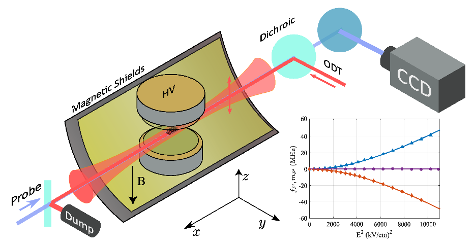 实验装置示意图,右下角实验数据展示原子能级随电场强度平方的非线性变化关系。