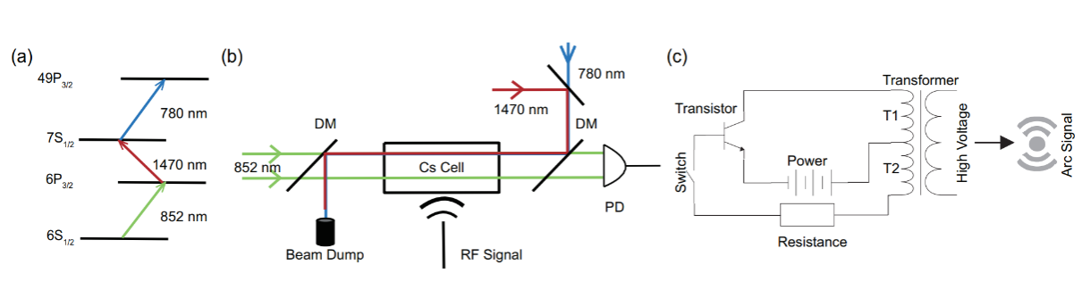 图 1 :物理模型图。(a)为三光子激发能级示意图。(b)为实验装置示意图。(c)为电弧射频信号发生电路示意图。