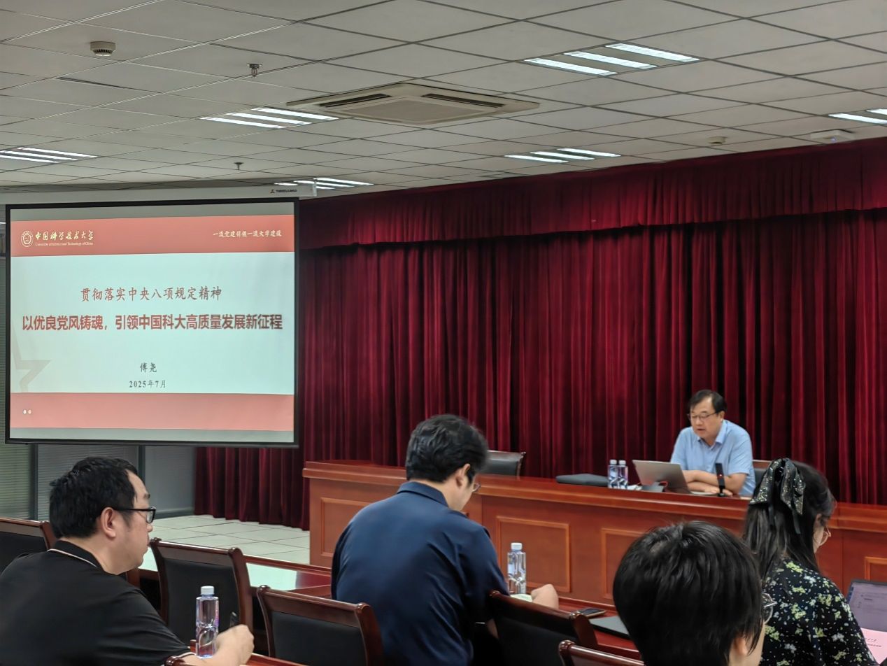 7月9日下午,校党委常委、副校长傅尧在图书馆四楼会议室以《以优良党风铸魂,引领中国科大高质量发展新征程》为题讲授专题党课。科研部与发展规划处联合党支部、环境科学与工程系研究生第一党支部的党员及入党积极分子参加了党课学习。报告会由科研部与发展规划处联合党支部副书记孙方稳主持。