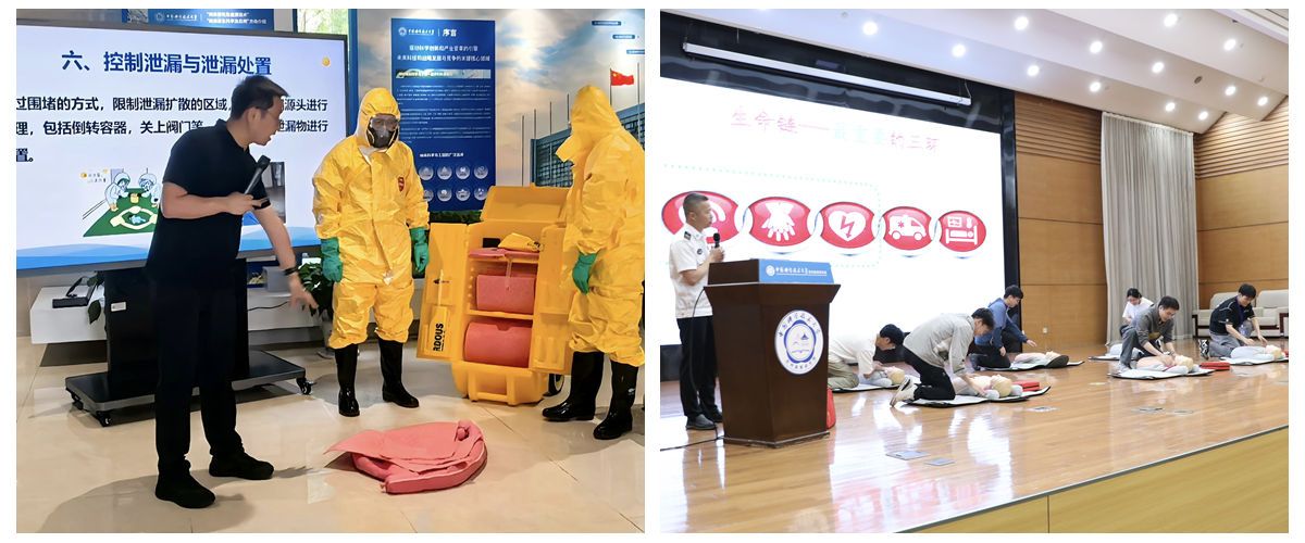 同时,苏州高等研究院通过校园网、微信群、宣传栏、展板、横幅及宣传手册等多种渠道进行广泛宣传,组织召开了动员部署暨安全知识培训会,传达部署中国科大关于安全工作的要求,宣贯安全规章制度,讲解消防安全、实验室安全、网络安全知识,开展心肺复苏、AED使用及模拟化学品泄漏处置等专项演练,邀请业内专家到院进行现场指导与演示,切实提升了师生应急处置实操能力。