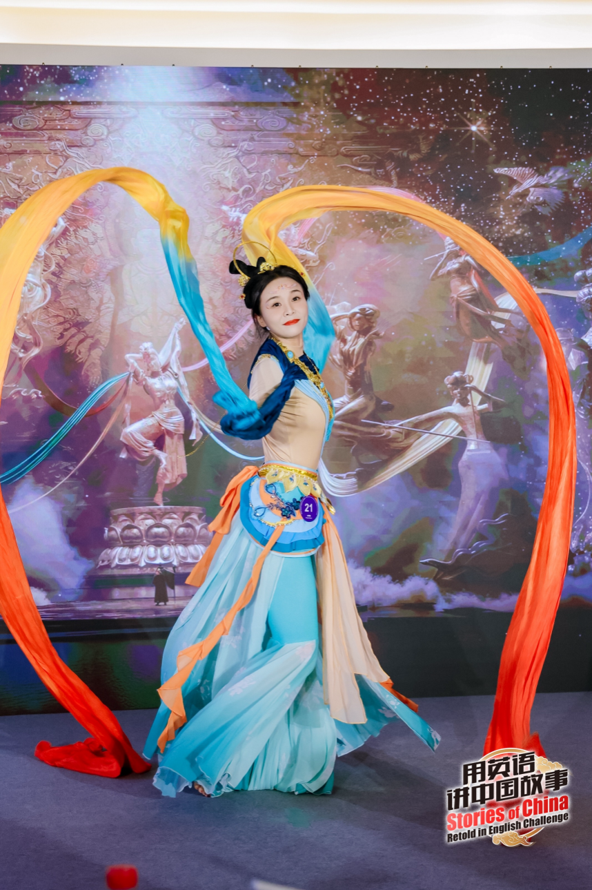 在才艺展示环节,马璇戈同学首先讲述了敦煌壁画悠久的历史与独具东方神韵的文化魅力。随后,她将壁画中静态的艺术形象转化为灵动的视觉之美,通过极具韵味的“三道弯”体态与飘逸流转的绸带,生动再现了“天衣飞扬,满壁风动”的飞天意境,赢得了现场评委与观众的高度评价与热烈赞誉。