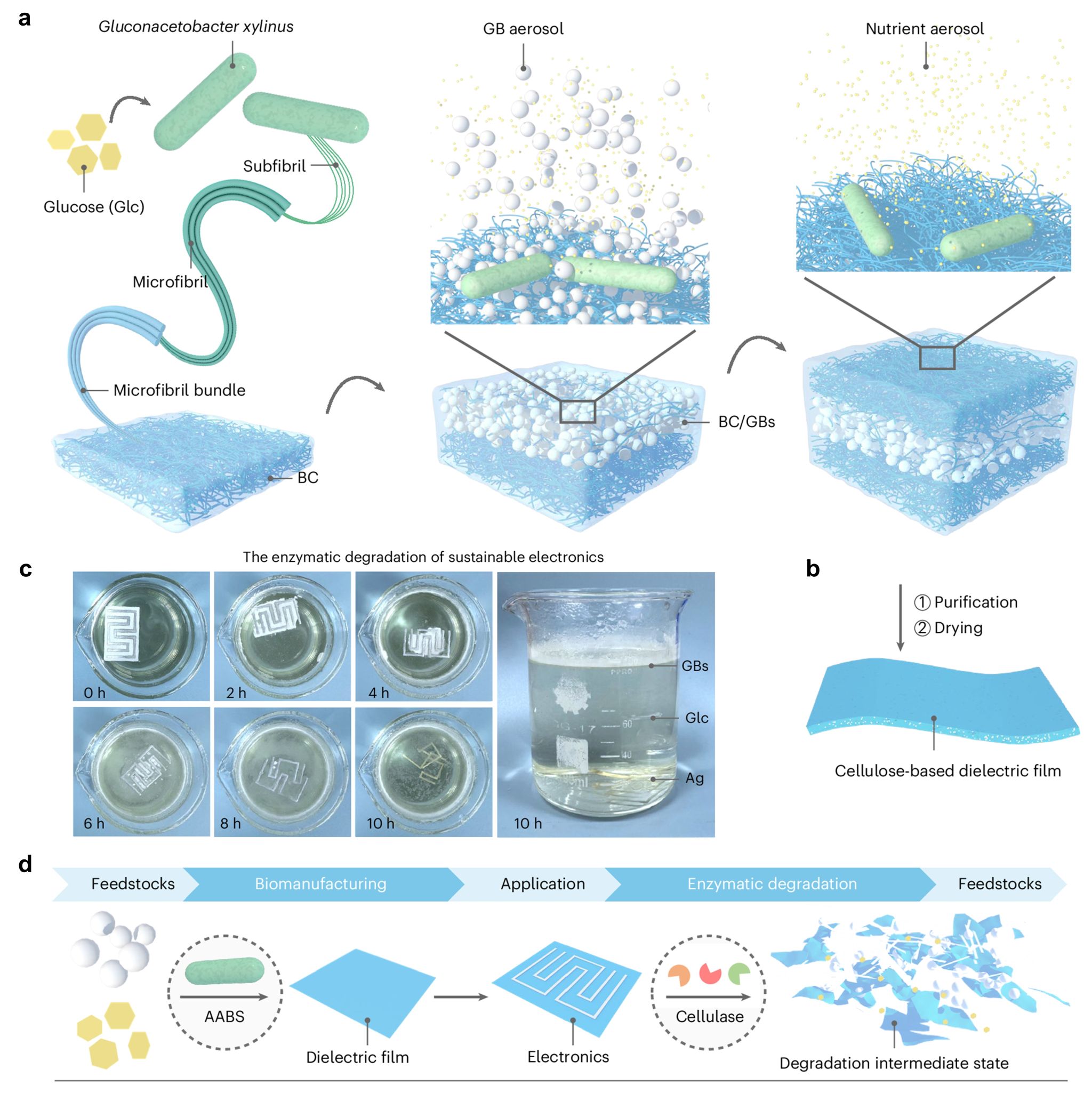 本项研究将团队发展的被称为“气溶胶辅助生物合成”的一种新兴生物制造策略与特异性的酶降解过程相结合,成功设计并制备出具有闭环生物可回收的纤维素基复合介电薄膜(图1)。该团队发展的气溶胶辅助生物合成法是一种通用且可扩展的策略,可将葡萄糖单体和功能构筑单元加工成纤维素基功能复合材料。同时,纤维素酶水解是一项成熟技术,能特异性地将纤维素解聚为葡萄糖,且不影响其他组分。上述两种生物过程足够温和,无需高温高压或使用有毒化学品,即可完成“原料-产品-废弃物”的闭环循环。