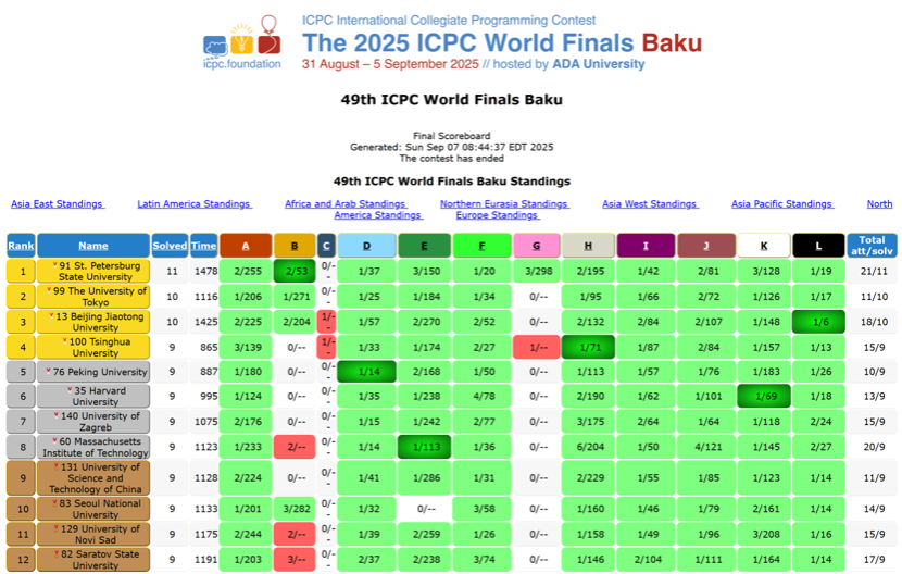 ICPC是全球规模最大、影响力最广的大学生程序设计竞赛之一。本届赛事共吸引了103个国家和地区、3424所高校的73083名学生参与。经过各区域赛的激烈选拔,最终有139所高校脱颖而出,获得全球总决赛的参赛资格。总决赛采用12题制,比赛时长300分钟,共颁发12枚奖牌(4金、4银、4铜)。最终,圣彼得堡国立大学以11题的成绩夺得冠军,东京大学和北京交通大学以10题的成绩紧随其后,清华大学以9题获得金牌。北京大学与中国科学技术大学同样解出9题,因罚时差异分获银牌和铜牌。