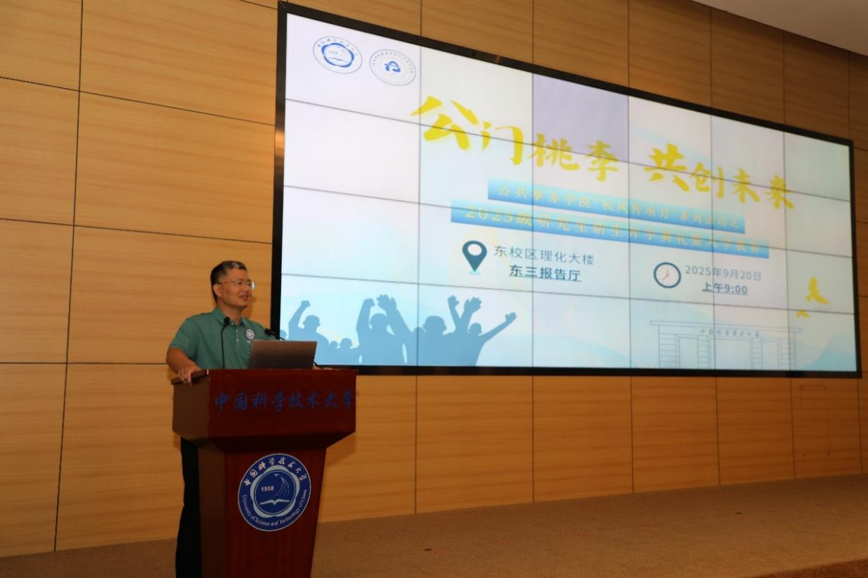 教师代表朱伟教授讲话。他以“国之大者”“脚踏实地”和“韧性”三个关键词寄语新生。他指出,作为公共事务学院的学生,应具备开阔的视野和宏大的格局,深刻理解国家所需、人民所盼,应时刻关注科技进步如何惠及社会,思考公共政策如何增进民生福祉,探索国家治理如何应对复杂挑战。同时,要秉持科大“理实交融”的传统,深入实践、研究真问题,避免脱离实际的“网吧式科研”,真正做“接地气”的学问。面对未来学习与生活中的挑战,他鼓励同学们培养“韧性”,既要专注学术,也要用心生活,通过丰富的校园活动和积极的人际交往,保持身心健康、增强抗逆能力,成长为有温度、有担当的时代新人。