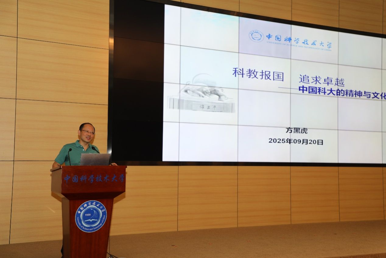 学校档案文博院执行院长方黑虎以《科教报国 追求卓越——中国科大的精神与文化》为题,围绕“中国科大的精神溯源”“文化标识中的科大精神”“科教报国:科大精神的价值取向”“追求卓越:科大精神的实践路径”四个部分展开阐述。他深入阐述了抗大精神、“两弹一星”精神、科学家精神共同孕育了“科教报国、追求卓越”的科大精神;他回溯了中国科大的创校历程,详细解读了校徽、校训、校风、校歌的深刻内涵,指出科大精神与红专并进的校训一脉相承;通过学习抗战中的科大先生和新时代的科大校友的先进事迹,他指出科大人对科大精神矢志不渝的坚守与代代相传;通过介绍中国科大教育创新、科技创新、人文关怀等方面的创举,他道出了科大精神历经67年坚持不懈的伟大实践。