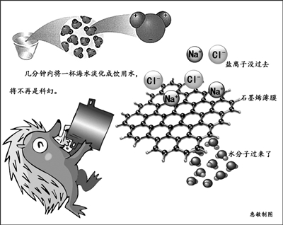研究表明,水环境中的氧化石墨烯薄膜与水相互作用后,形成约0.9纳米宽的毛细通道,允许直径小于0.9纳米的离子或分子快速通过,而直径大于0.9纳米的离子被完全阻隔。这一发现合理解释了实验结果,也被称为“离子海绵效应”。专家称,如果通过机械手段进一步压缩薄膜中的毛细通道尺寸,将能高效率地过滤海水中的盐分。这意味着制造一个在几分钟内即可将一杯海水淡化成饮用水的过滤装置已不再是科幻小说场景。
