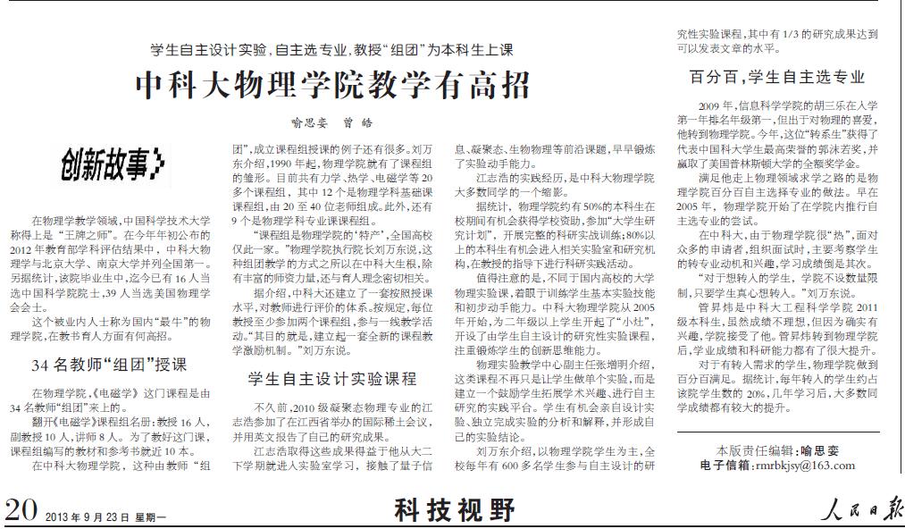 • [人民日报]中科大物理学院教学有高招(创新故事)